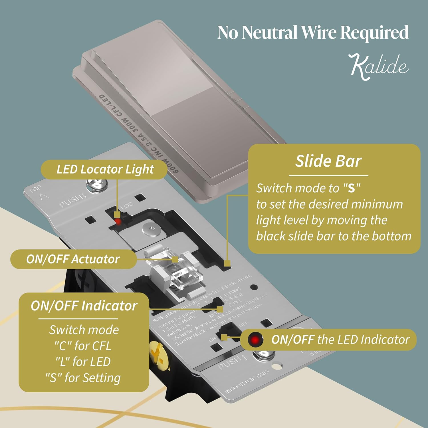 Dim LED lights to create the perfect ambiance with the Kalide dimmer wall switch; supported by major-brand light bulbs from GE, Cree, Philips, Sylvania, Lithonia, Amazon Basics, EcoSmart, and more; not compatible with smart lighting fixtures