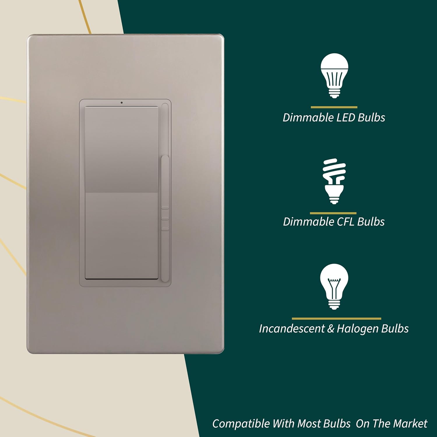Nickel color; 300W LED/CFL; compatible with dimmable light bulbs only; single pole or three-way application; #14-#12 AWG (copper only); neutral wire not required; 1-year warranty; UL listed