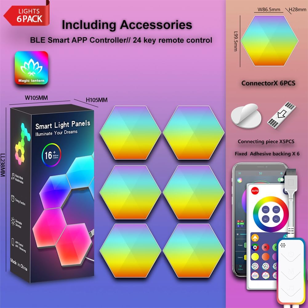 【Creative DIY Customization】:The hexagonal wall light contains 6 or 10 individual panels (for your choice). Design the layout of this LED light wall panel by yourself. You can freely combine and splice it into different shapes to create a more personalized lighting setup, creating your own personalized pattern for your game room, living room, bedroom and more wall decoration scenes