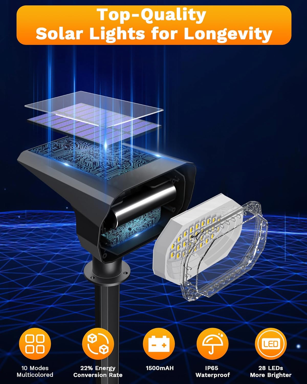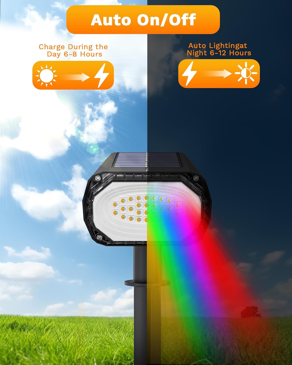 10 Lighting Modes for RGBW Solar Spotlights Outdoor: Choose from two RGB modes and eight single colors (Warm White, White, Red, Green, Blue, Yellow, Cyan, Purple). Customize your outdoor lighting with RGBW solar lights