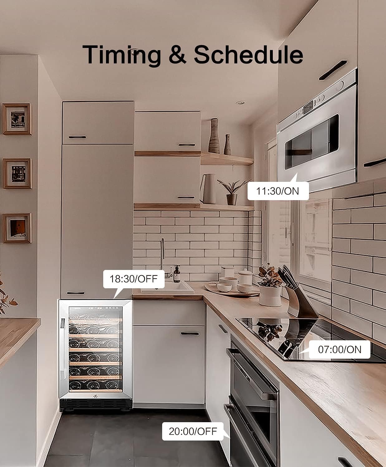 Automate Timer: Create the customized schedule on APP to automatically turn on/off home appliances like fish tank, air conditioner, Christmas lights, coffee maker, fans, etc. Rating: 120V, 60Hz, 15A/1800W.