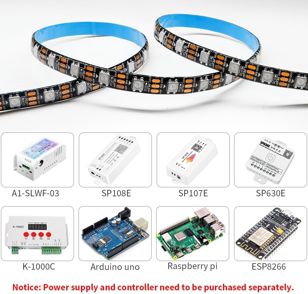 【Compatible Controllers】 The addressable WS2812B IC chip is built-in the 5050 RGB SMD, Each LED can have its own color and brightness according to your wishes.. Compatible with A1-SLWF-03 WLED, K-1000C, Rasp Pi, UNO R3, ESP8266, ESP32.etc Programmable Controllers. Support SP611E, SP621E, and SP602E.etc music controllers. Support SP530E, DR03W, and SP511E.etc smart music controllers. Controllers need to be purchased separately.